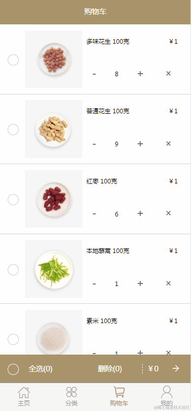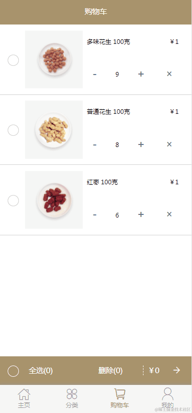 全选/反选,这里有两个注意的地方,全选/反选的实现有两种状态,一是每个商品单选被全选或反选后全选按钮也会跟随状态,二是全选按钮全选或反选后所有单选按钮也会跟随状态
