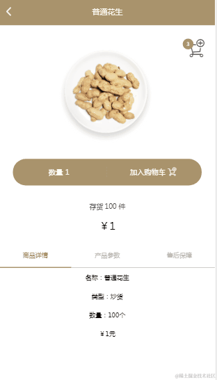 countShopItem(_data) { if (!_data._id) {//阻塞商品id为空现象 return } let _shopCar = this.state//获取原购物车列表 let list = _shopCar.filter(function (item) { return item._id === _data._id;//通过id查找购物车中传递项 }); if (list.length == 0) {//未找到时新建购物车商品 _data.sum = _data.shopCount * _data.shopPrice;//商品总价 _data.isSelect = false//是否选中商品,购物车界面默认值 _shopCar.push(_data); } else if ((_data.shopNum > list[0].shopCount + _data.shopCount) && (list[0].shopCount + _data.shopCount <= 9) && list[0].shopCount + _data.shopCount > 0) {//找到时更新商品 list[0].shopCount += _data.shopCount; list[0].sum = list[0].shopCount * list[0].shopPrice; } else if (list[0].shopCount + _data.shopCount <= 0) {//购物车允许最小值 this.$events.emitEvent(EventName.CountShop, 'min'); return; } else {//购物车允许最大值 this.$events.emitEvent(EventName.CountShop, 'max'); return; } this.state = _shopCar this.$events.emitEvent(EventName.CountShop); }这样,一个简单的商品详情页面就完成了