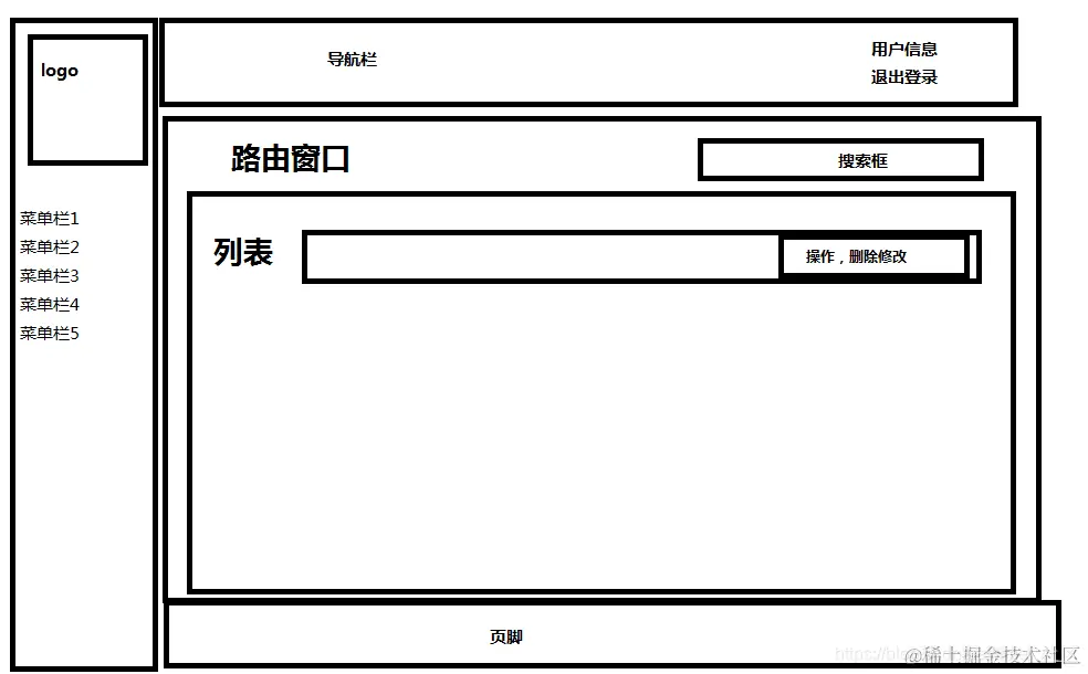- 首先在心中构思一下数据管理的结构,管理系统一般是顶部菜单和侧边菜单,这里我们用侧边栏进行路由