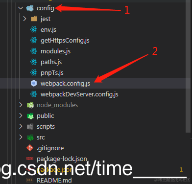 npm install less-loader less --save - 配置less: 运行完eject后package.json中的eject项会消失,此时项目中会多出一个config文件夹,其中就是webpack的配置文件,我们打开webpack.config.js文件,通过搜索找到默认配置的sass配置项,照葫芦画瓢,将less配置好,同理将less-loader配置好(如下图)
