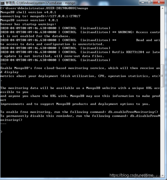 安装mongoDB: 下载安装MongoDB,与node一样配置环境变量,在cmd中输入mongo,出现类似这样的,就说明安装配置成功