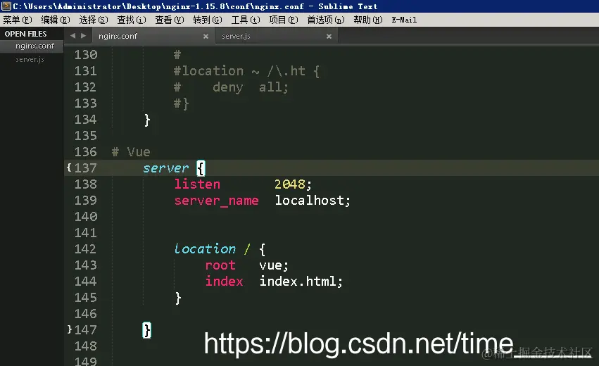在目录nginx-1.15.8\conf\下找到nginx.conf文件,用编辑器打开,为自己的项目添加代理(这里我用的是Vue,端口号2048,root是Nginx主目录下一级文件名,index是vue文件夹下的入口页面)