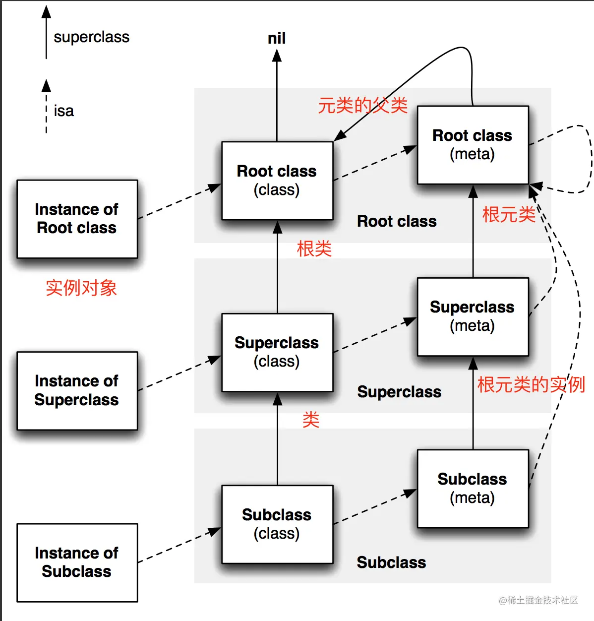 由下图可见对象 类 元类 中isa指针的指向 (来源:github.com/FrizzleFur/…)