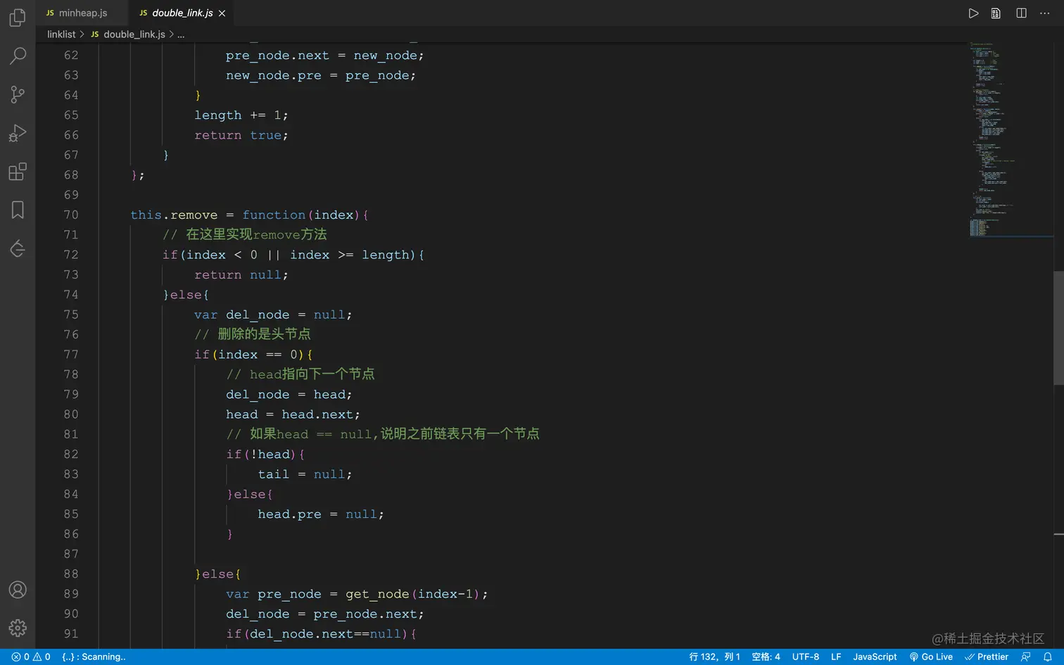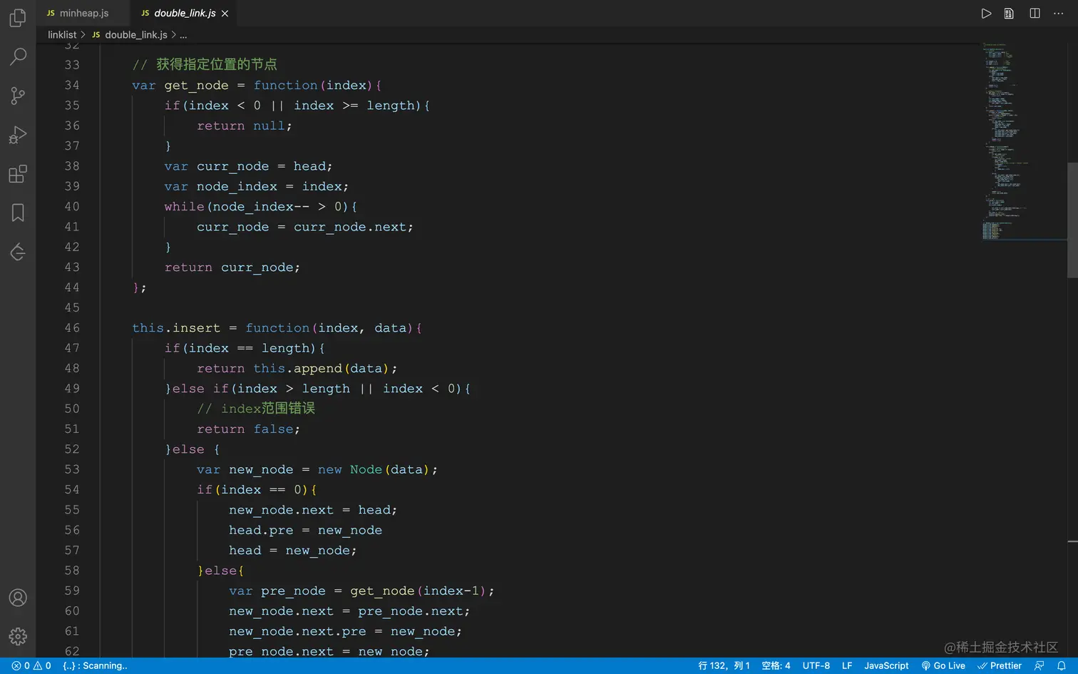 var length = 0; // 长度 var head = null; // 头节点 var tail = null; // 尾节点 // 添加一个新元素 this.append = function(data){ // 创建新节点 var node = new Node(data); // 如果是空链表 if(head==null){ head = node; tail = head; }else{ tail.next = node; // 尾节点指向新创建的节点 tail = node; // tail指向链表的最后一个节点 } length += 1; // 长度加1 return true; }; // 返回链表大小 this.length = function(){ return length; }; // 获得指定位置的节点 var get_node = function(index){ if(index < 0 || index >= length){ return null; } var curr_node = head; var node_index = index; while(node_index-- > 0){ curr_node = curr_node.next; } return curr_node; }; // 在指定位置插入新的元素 this.insert = function(index, data){ // index == length,说明是在尾节点的后面新增,直接调用append方法即可 if(index == length){ return this.append(data); }else if(index > length || index < 0){ // index范围错误 return false; }else{ var new_node = new Node(data); if(index == 0){ // 如果在头节点前面插入,新的节点就变成了头节点 new_node.next= head; head = new_node; }else{ // 要插入的位置是index,找到索引为index-1的节点,然后进行连接 var pre_node = get_node(index-1); new_node.next = pre_node.next; pre_node.next = new_node; } length += 1; return true; } }; // 删除指定位置的节点 this.remove = function(index){ // 参数不合法 if(index < 0 || index >= length){ return null; }else{ var del_node = null; // 删除的是头节点 if(index == 0){ // head指向下一个节点 del_node = head; head = head.next; // 如果head == null,说明之前链表只有一个节点 if(!head){ tail = null; } }else{ // 找到索引为index-1的节点 var pre_node = get_node(index-1); del_node = pre_node.next; pre_node.next = pre_node.next.next; // 如果删除的是尾节点 if(del_node.next==null){ tail = pre_node; } } length -= 1; del_node.next = null; return del_node.data; } }; // 删除尾节点 this.remove_tail = function(){ return this.remove(length-1); }; // 删除头节点 this.remove_head = function(){ return this.remove(0); }; // 返回指定位置节点的值 this.get = function(index){ var node = get_node(index); if(node){ return node.data; } return null; }; // 返回链表头节点的值 this.head = function(){ return this.get(0); } // 返回链表尾节点的值 this.tail = function(){ return this.get(length-1); } // 返回指定元素的索引,如果没有,返回-1 // 有多个相同元素,返回第一个 this.indexOf = function(data){ var index = -1; var curr_node = head; while(curr_node){ index += 1 if(curr_node.data == data){ return index; }else{ curr_node = curr_node.next; } } return -1; }; // 输出链表 this.print = function(){ var curr_node = head; var str_link = "" while(curr_node){ str_link += curr_node.data.toString() + " ->"; curr_node = curr_node.next; } str_link += "null"; console.log(str_link); console.log("长度为"+ length.toString()); }; // isEmpty this.isEmpty = function(){ return length == 0; }; // 清空链表 this.clear = function(){ head = null; tail = null; length = 0; };};