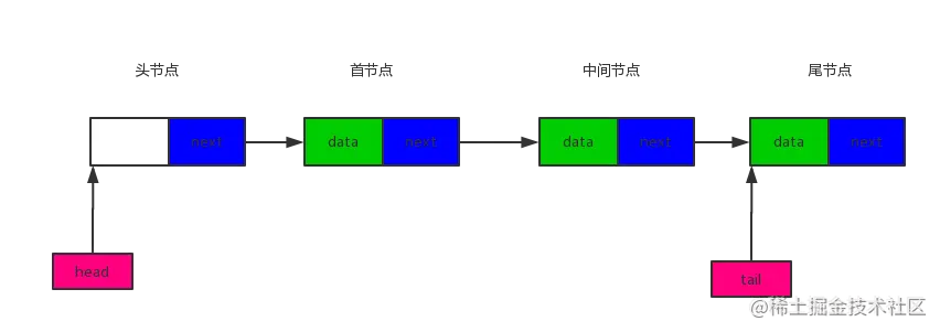 链表中的第一个节点是首节点,最后一个节点是尾节点。
