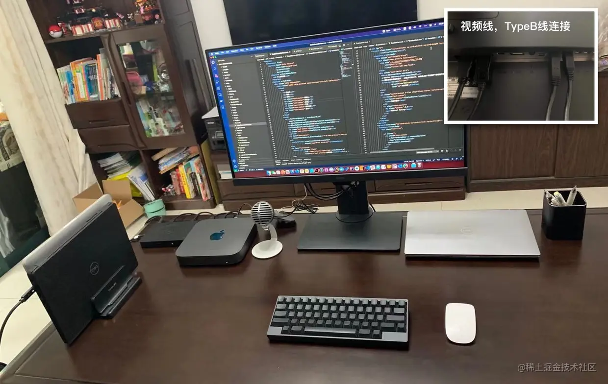 将我的工作笔记本,以及开发用的mac mini分别用HDMI视频线、Type B线与PD2700U显示器相连后,便可以启动KVM功能了。在功能菜单中,通过选择不同的USB源,便可以轻松实现一套鼠标键盘控制不同的主机。此外,还可以通过在显示器设置中,配置快捷键,实现一键快速切换。