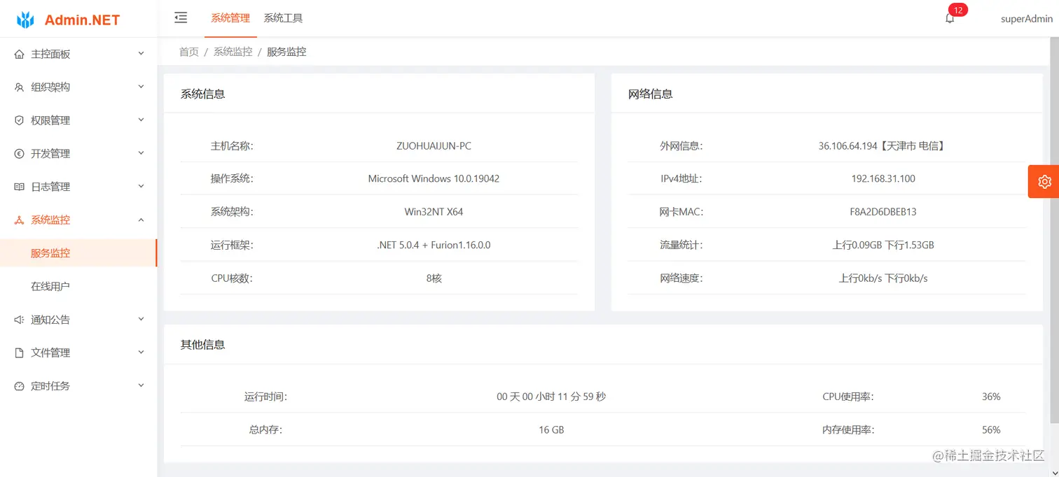 - 服务监控、服务器的运行状态,CPU、内存、网络等信息数据的查看。