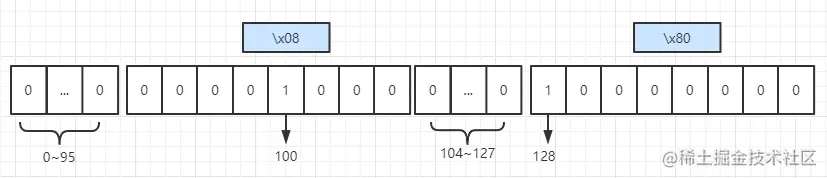 将16进制的数据转化为2进制数据,如下图所示,第100位和第128位为1,其他为0: