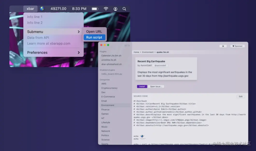 xbar 可以将任何脚本或程序的输出放入 macOS 菜单栏,xbar 具有丰富的生态,收录了大量电商、游戏、健身、IoT 等等方面插件,你可以直接使用它们来管理你的工作、生活。