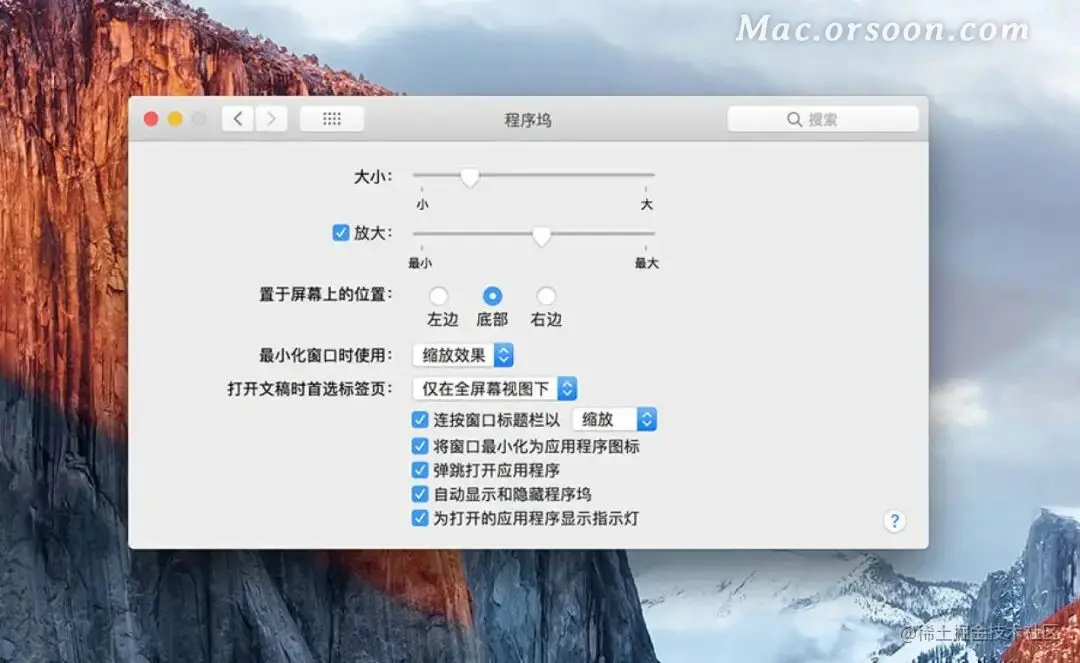 1. 打开系统偏好设置,点击Dock或程序坞图标