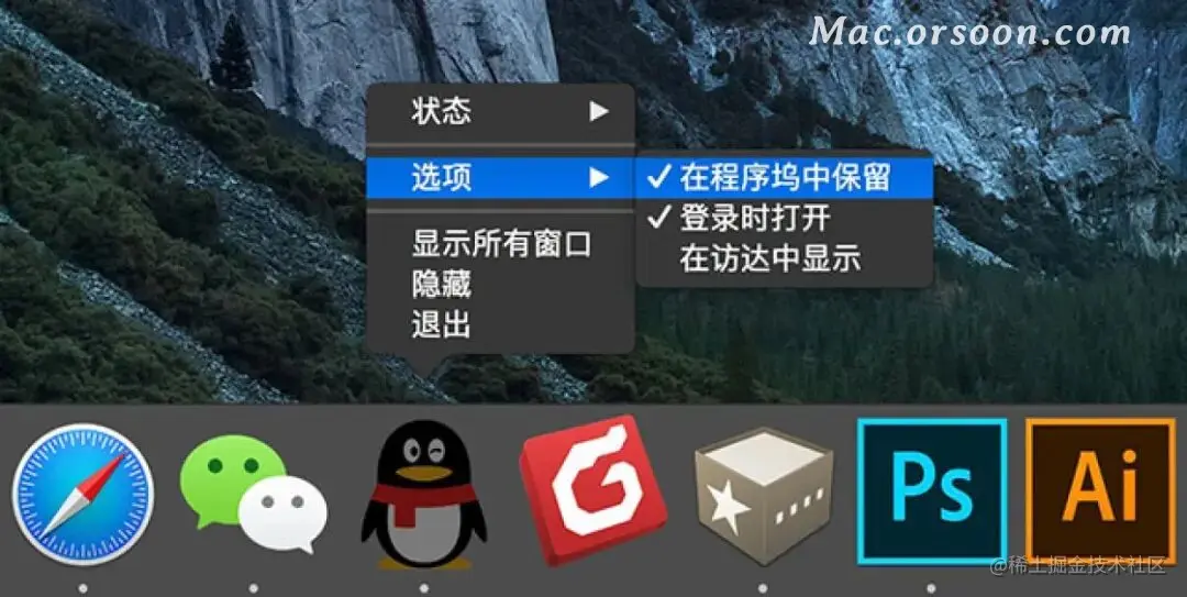 4. 若应用程序正在使用,可直接在Dock栏中右键该应用图标,在选项列表中选择在程序坞中保留