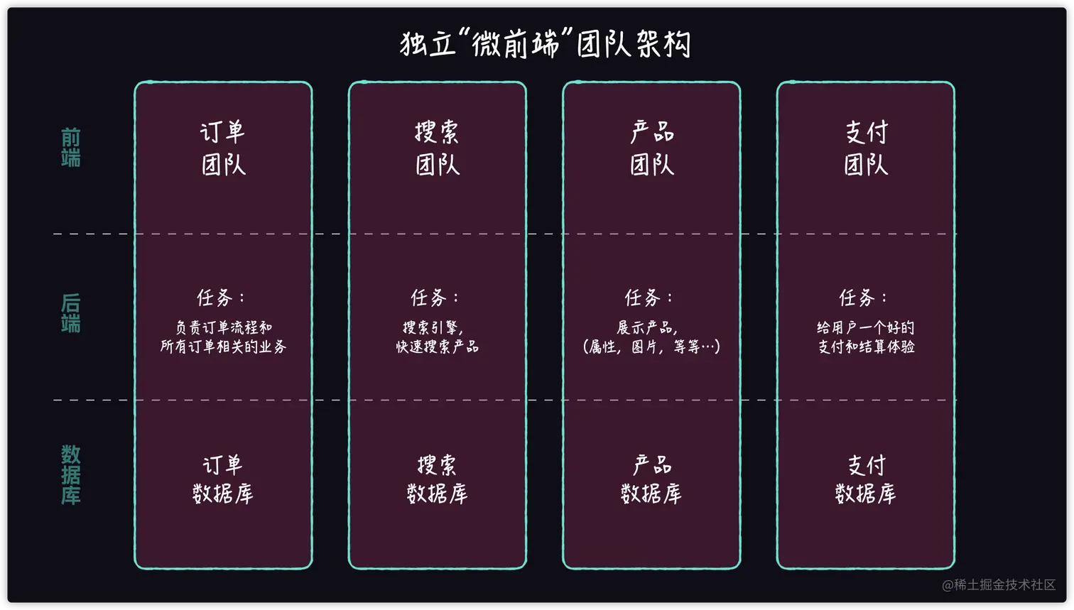 在上面的图中,我们就可以看到微前端在一个研发中心里的组织架构。每一个微前端团队都会负责一个独立的业务模块。每一个模块都会有他们自己的核心业务。与其他业务的功能其实是相对独立的,但是业务的流程上他们就会通过数据流、交互流、接口等方面串联起来。