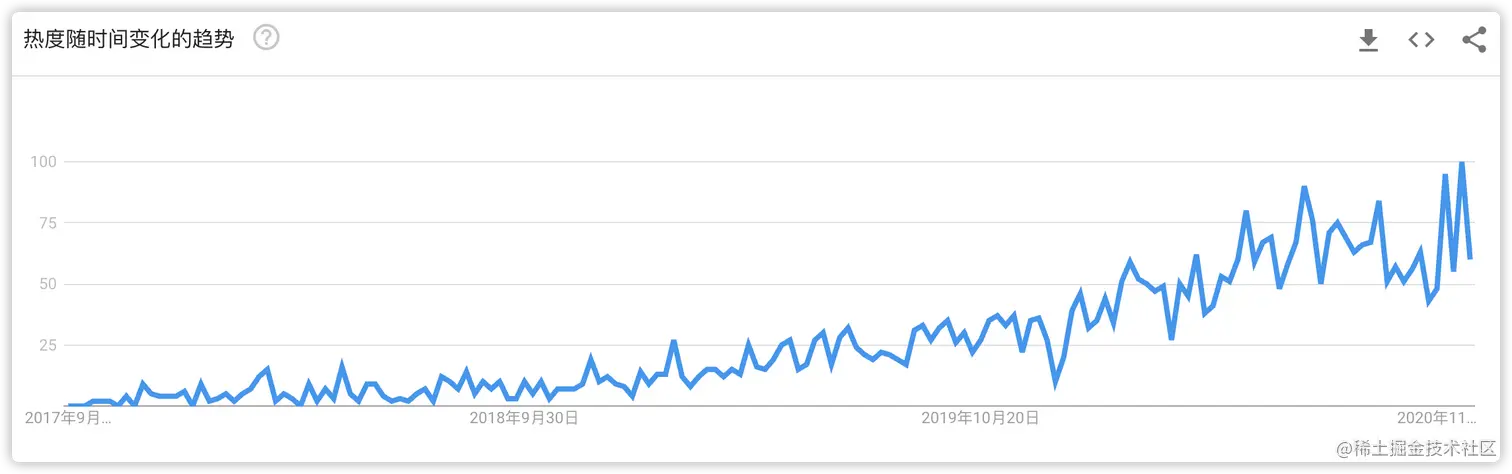 如果我们看谷歌的热度趋势图,我们可以看到 Tailwind CSS 的热度还在持续的往上升。