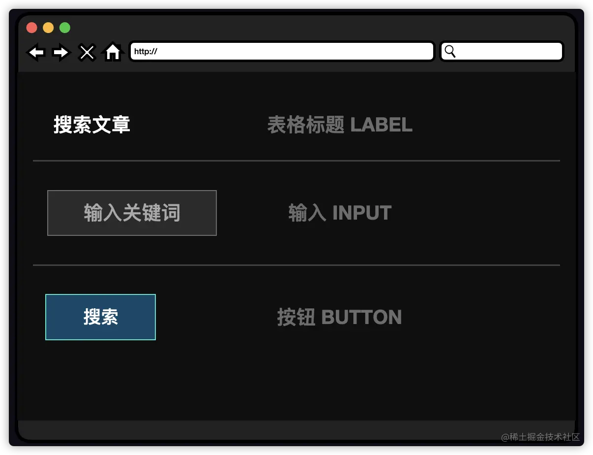 比如一个搜索分子(Search Molecule)就是由 input-text(输入文本)+ button(按钮)+ label(标题)等原子所组成。然后这些分子组合起来就会变成一个生物体(Organism)。