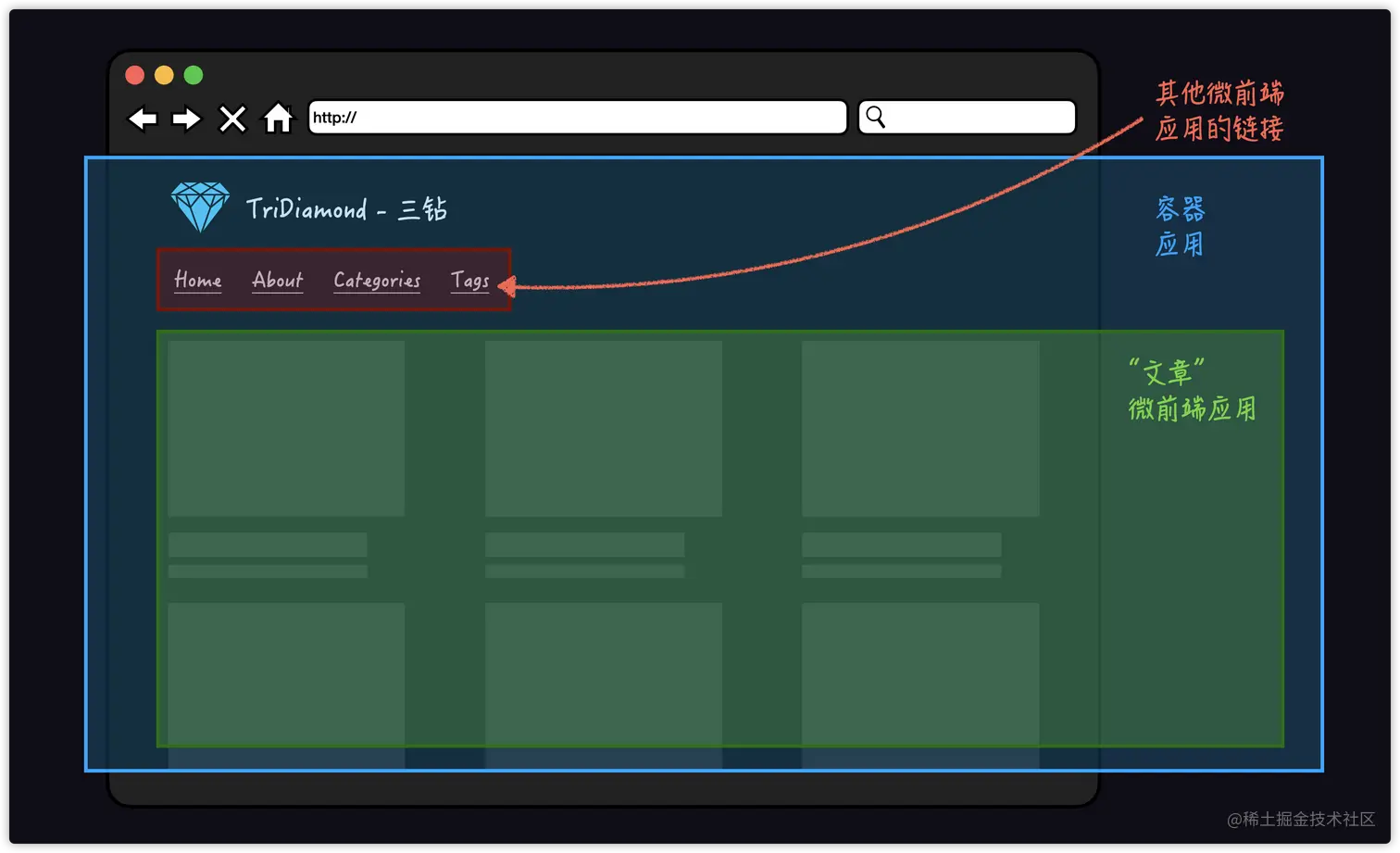 其实所有的集成方法,都围绕着一个很自然的设计模式 —— 一个应用里面的每一个页面都是一个 “单独的” 微前端应用。而在每一个页面中都会有一个“单独的应用容器(single container application),而它的作用就是: