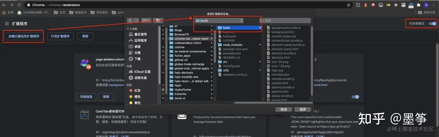 3,开启开发者模式,然后点击左上角的加载已解压的扩展程序按钮,选择chrome-skeleton-extension所在目录下的build文件夹,点击选择按钮之后便安装完成。