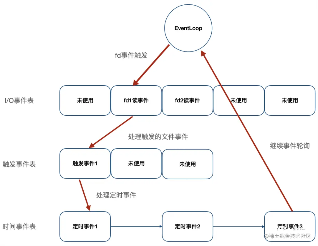 文件事件:Redis服务器通过套接字与客户端(或者其他Redis服务器)进行连接,而文件事件就是服务器对套接字操作的抽象;服务器与客户端的通信会产生相应的文件事件,而服务器则通过监听并处理这些事件来完成一系列网络通信操作,比如连接accept,read,write,close等;时间事件:Redis服务器中的一些操作(比如serverCron函数)需要在给定的时间点执行,而时间事件就是服务器对这类定时操作的抽象,比如过期键清理,服务状态统计等。