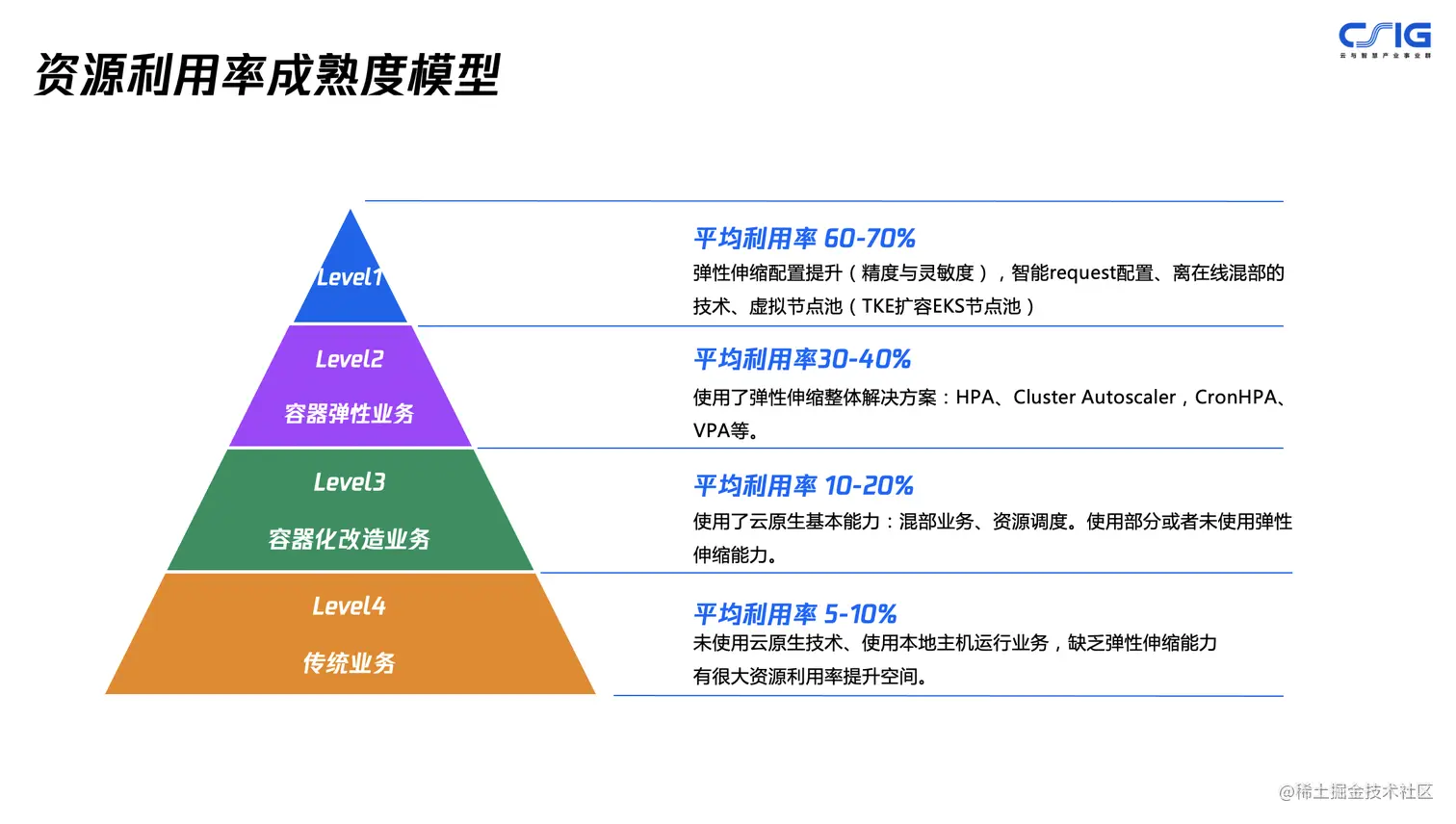 针对本次调研的数据分析,腾讯云原生团队提出了容器化资源利用率成熟度模型。