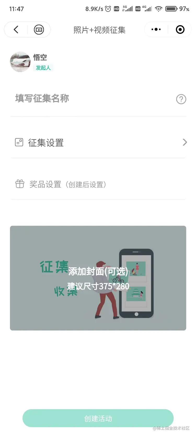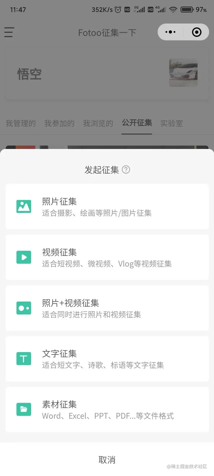 **1、**点击 + 号创建活动,选择需要征集的类型