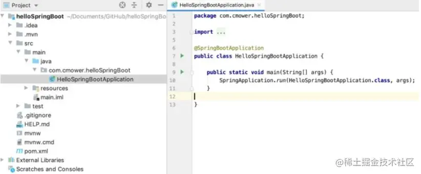 HelloSpringBootApplication 为项目的入口,带有 main() 方法。我们知道,传统的 Web 项目通常需要放到 Tomcat 等容器下面启动运行,而 main() 方法则预示着该项目可以作为一个 jar 包直接运行——因为 Spring Boot 已经内置了 Tomcat。