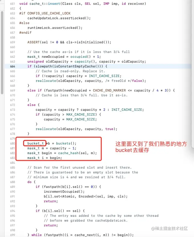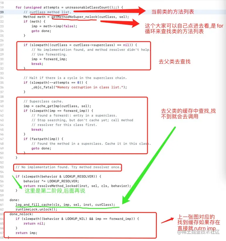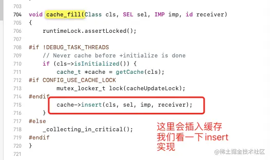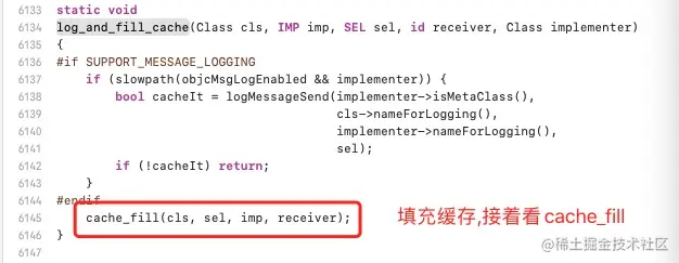 上面那个 getMethodNoSuper_nolock 这个就是我们经常说的,拿到这个sel到类对象里面去查找方法,一会我们再看怎么去类对象里面查找,先看其他的,接下来我们就会去看log_and_fill_cache这个方法的具体实现(听名字也知道是fill_cache,找到以后填充缓存)请看下图
