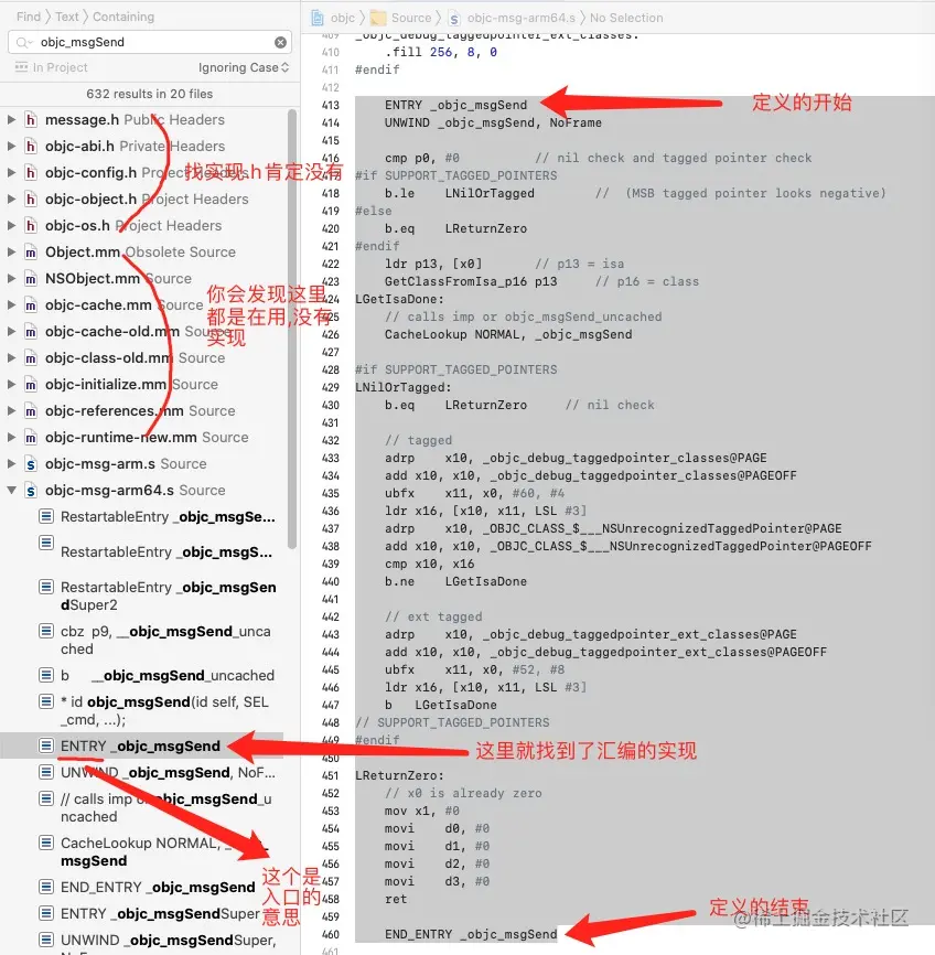 最终我们会找到arm64里面的(iphoneos是arm64位),ENTRY是入口,接下来我们就大致看一下汇编的实现如下: