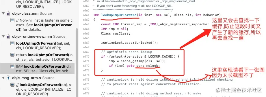 然后我们再在这个文件搜索_lookUpImpOrForward方法,你会发现找不到了(这个不截图了),这个就是汇编的最后一步,那怎么办呢?我们就去全局搜索,看看c++语言有没有实现,这个时候你会发现能找到(注意_lookUpImpOrForward,在汇编语言会多一个_,我们平时项目打印的时候也能看到,所以你搜索的时候直接搜lookUpImpOrForward),还是搜索实现,你会发现你能找到如下的代码:
