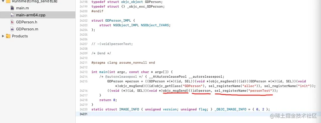 现在把上面的代码转成c++代码,我们看一下底层是怎么实现的(划到最下面,找到main函数实现)如下图:( xcrun -sdk iphoneos clang -arch arm64 -rewrite-objc main.m -o main-arm64.cpp)