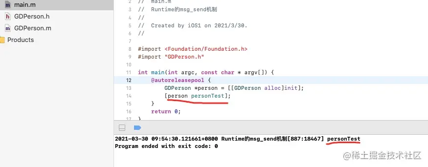 其他的基础知识我就不介绍了,直接进入正题,请看下面的代码:我是创建了一个继承NSObject的GDPerson的类,创建了personTest方法,里面打印了方法名字如下: