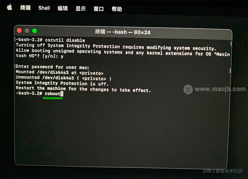 9.出现 System Integrity Protection is off. 证明 SIP 已成功关闭。