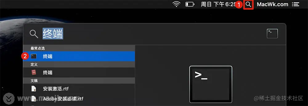 打开终端输入以下命令并回车(可以通过点击屏幕右上角的搜索图标,输入终端快速运行):