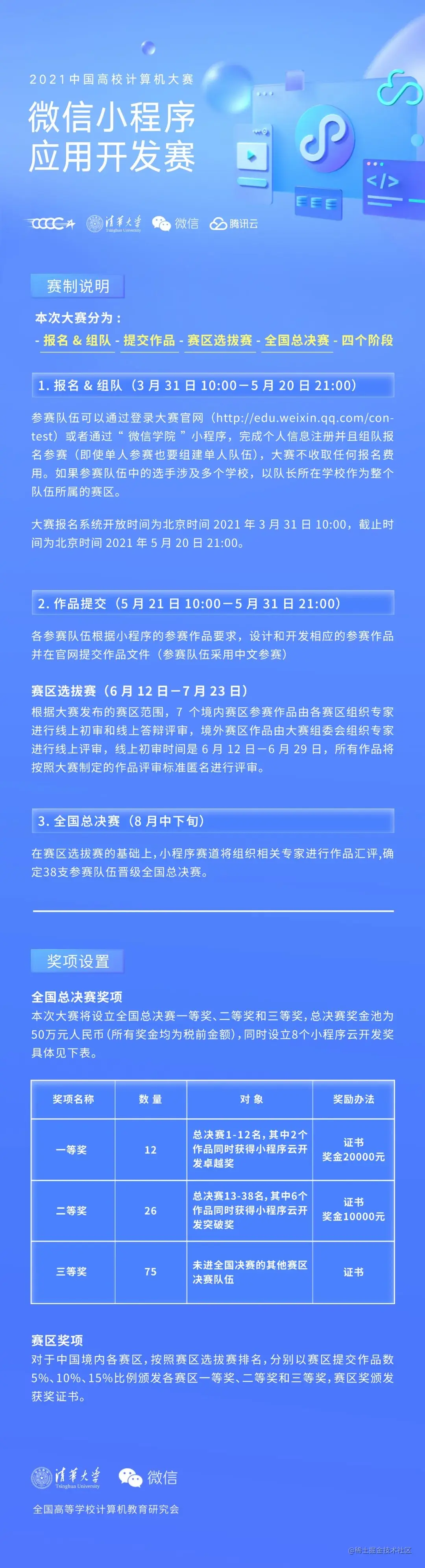 微信小程序应用开发赛是“中国高校计算机大赛”中的一项重要赛事,自2018年举办首届以来,参赛人数累计近5万人,我们发掘了许多优秀的“IT青年”,他们从这里开始,开启了自己的职业梦想。2021年微信小程序应用开发赛由清华大学与腾讯公司微信事业群联合主办,面向全球高校在校生开放。