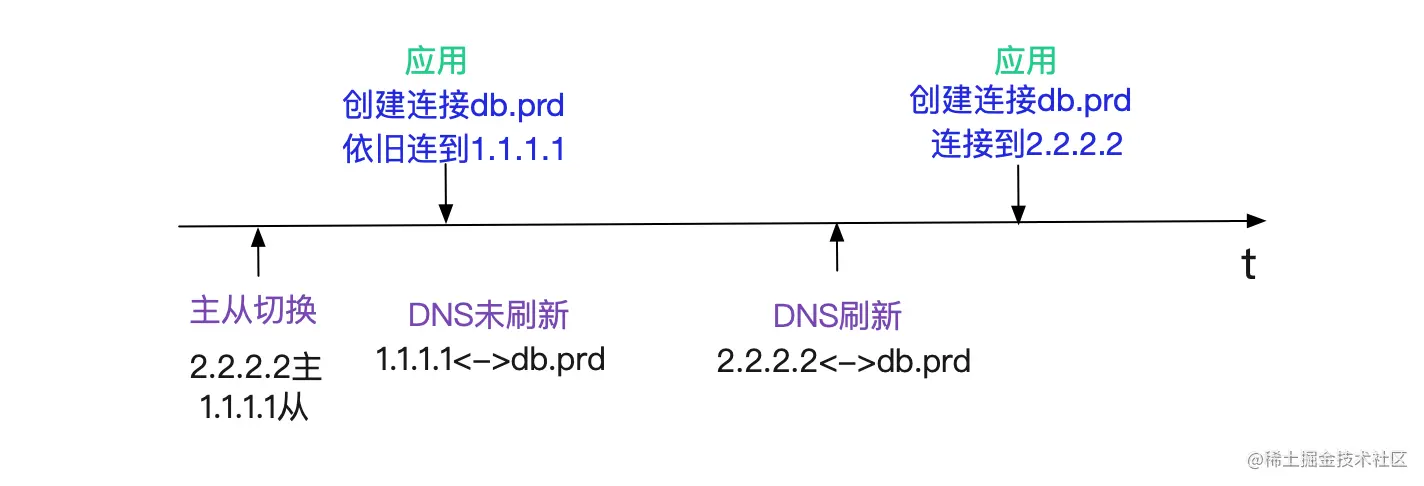 最先想到的是主从切换到DNS反应过来有延迟。例如主从切换完,DNS在2min后才能生效,所以在此期间新建的连接还是到从库。