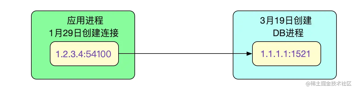 看到这个连接创建时间,笔者第一反应,DBA确定杀连接了吗?问了下DBA有没有可能是统计问题。DBA听了后,告诉笔者,他们都重启过数据库了,怎么可能还有连接存在呢?看了下DB进程的创建时间。