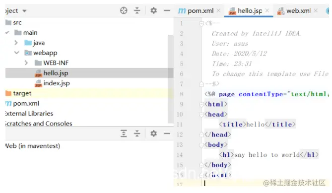在webapp文件夹下创建好一个hello.jsp文件