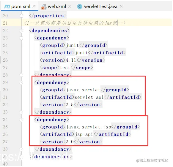需要在pom.xml中导入servlet的jar包的地址
