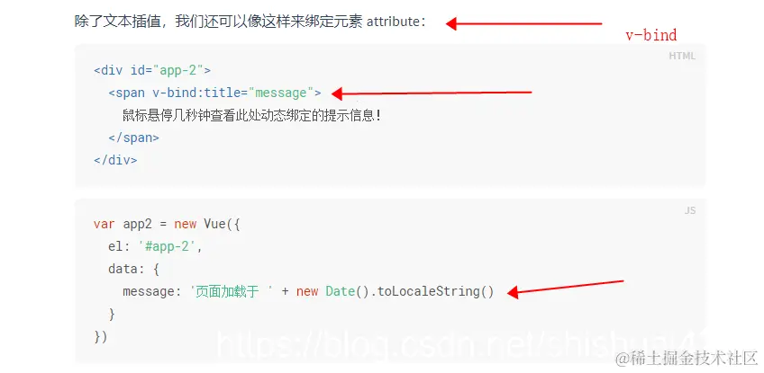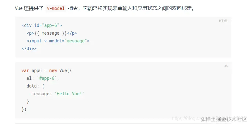 - 我的学习习惯是先看官方文档,下图不但指出了定义,还给出了一个小例子,第一个是v-model,第二是v-bind,到这大家可以先有一个直观的认识。