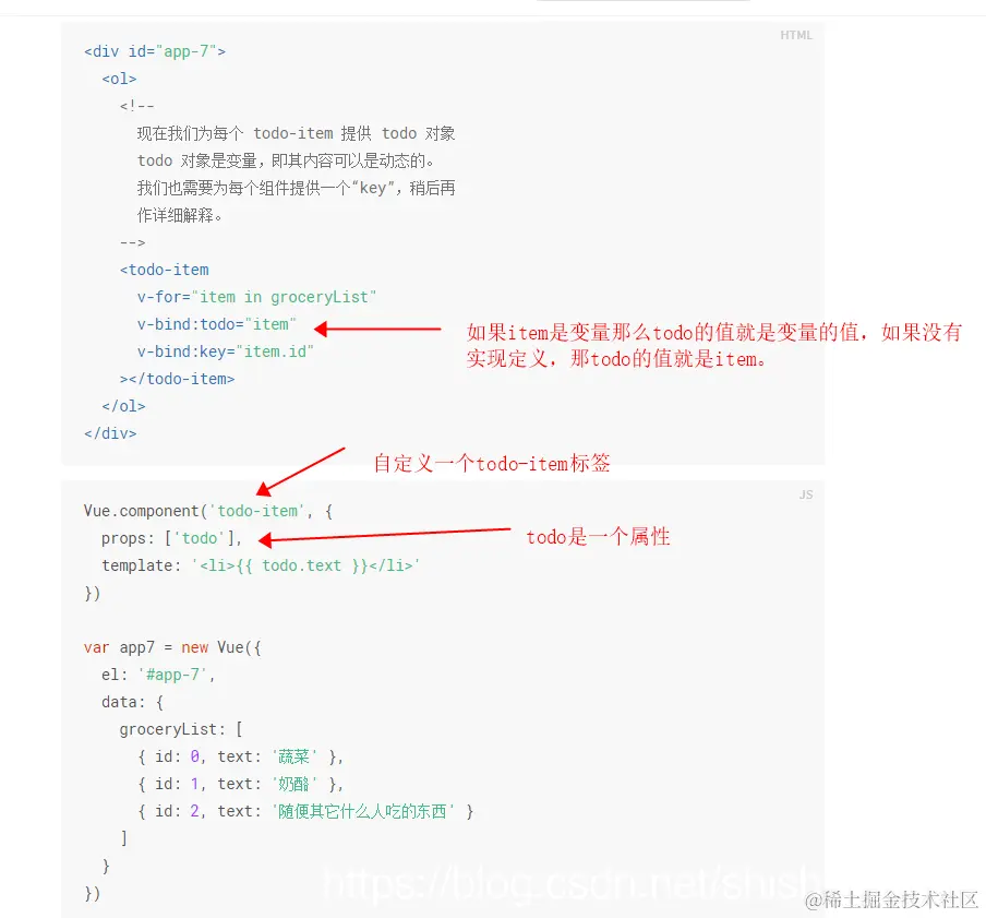 - 上图这个列子也指出了如何自定一个标签,简单提一下语法componet的第一个参数“todo-item”是定义标签名称,第二个参数是一个{},里面的props是定义标签属性,template是定义标签的显示格式,例子中是个<li>标签,即<todo-item>最终会被渲染成<li>。