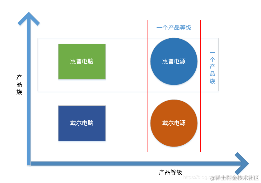 - 产品等级:抽象父类和其不同产品子类构成一个产品等级。