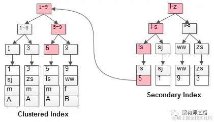 (4)InnoDB的聚集索引存储数据行本身,普通索引存储主键;