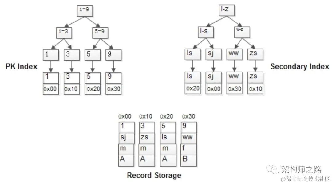 (2)MyISAM的索引叶子节点存储指针,主键索引与普通索引无太大区别;