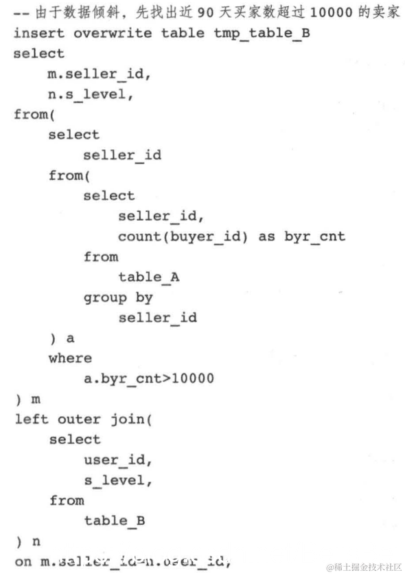 但是本数据倾斜问题无法用 mapjoin table_B 解决,因为卖家有超过千万条、文件大小几个GB ,超过了 mapjoin 表最大 1GB 的限制。