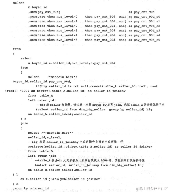 首先需要知道大卖家的名单,即先建立一个临时表动态存放每日最新的大卖家(比如dim_big_seller),同时此表的大卖家要膨胀预先设定的倍数(比如1000倍)。