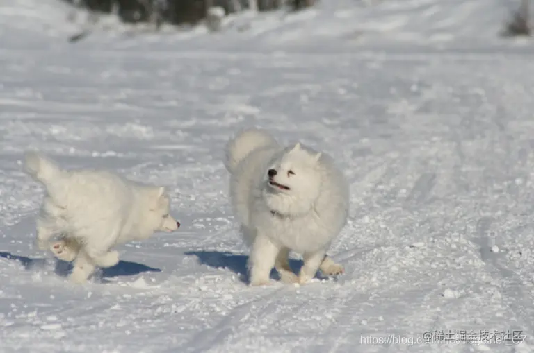 real_caption = 'Two white dogs are playing in the snow'