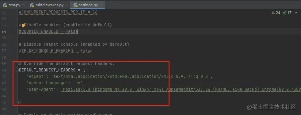 为了使其生效,我们还得去setings.py这个文件,将DOWNLOADER_MIDDLEWARES打开,如下图所示: