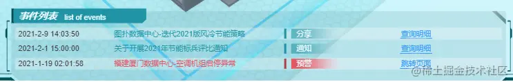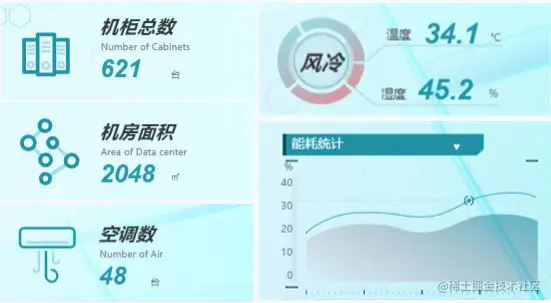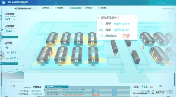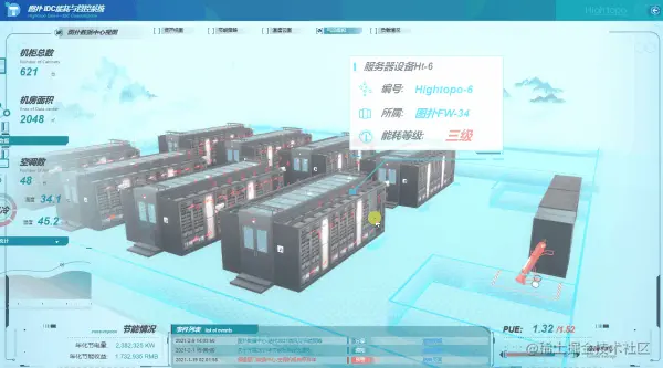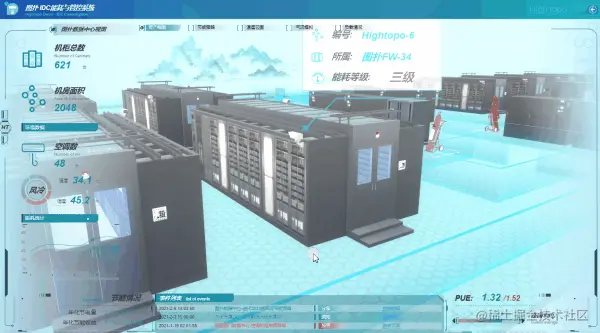 同时作为一个监控系统,预警、告警不可少。对接感知网络数据,通过事件列表展示后台实时推送的数据信息,实现显示数据实时感知,设定预警阀值实现数据监测预警,有效监控监测数据业务数据运行态势。 PUE (Power Usage Effectiveness),作为评价数据中心能源效率的指标,通过数据面板直观展示。