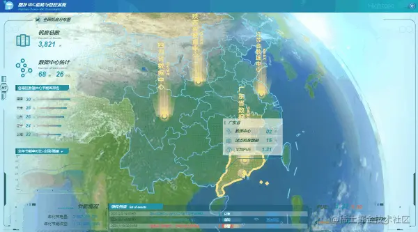 利用三维虚拟仿真技术对三维地球进行立体全景展示,通过采用 HT 的球体模型加以匹配地理环球贴图来实现该效果。并可通过接入各个数据中心的经纬度信息自动生成坐标点的位置,直观展示分布在全球各地的数据中心。虽然 HT 也整合了开源 Cesuim 的方案实现 GIS 的功能,该方式完全不必采用 WebGIS 相关功能模块,而是通过简单的三角函数进行球体坐标算法运算来实现预期效果,相比之下采用该方案来实现会更加轻量快捷,甚至不需要建模的介入就可以完成,极大降低了实施成本和周期。