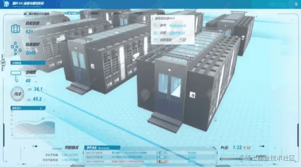 当与监控可视化相结合时,便实现了与动环监控系统的PDU(Power Distribution Unit,电源分配单元)监控集成,机柜实时功率分布统计和机房PUE(Power Usage Effectiveness)的展示。能按不同区域查看能耗的用量,如楼层、房间、机柜进行查找和统计。运维人员不再需要通过原始数据去推理建立心理形象,而是直接用感官快速理解情况。