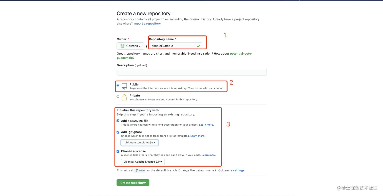 - 首先输入仓库的名字,我这里输入simpleExample,用来做演示
