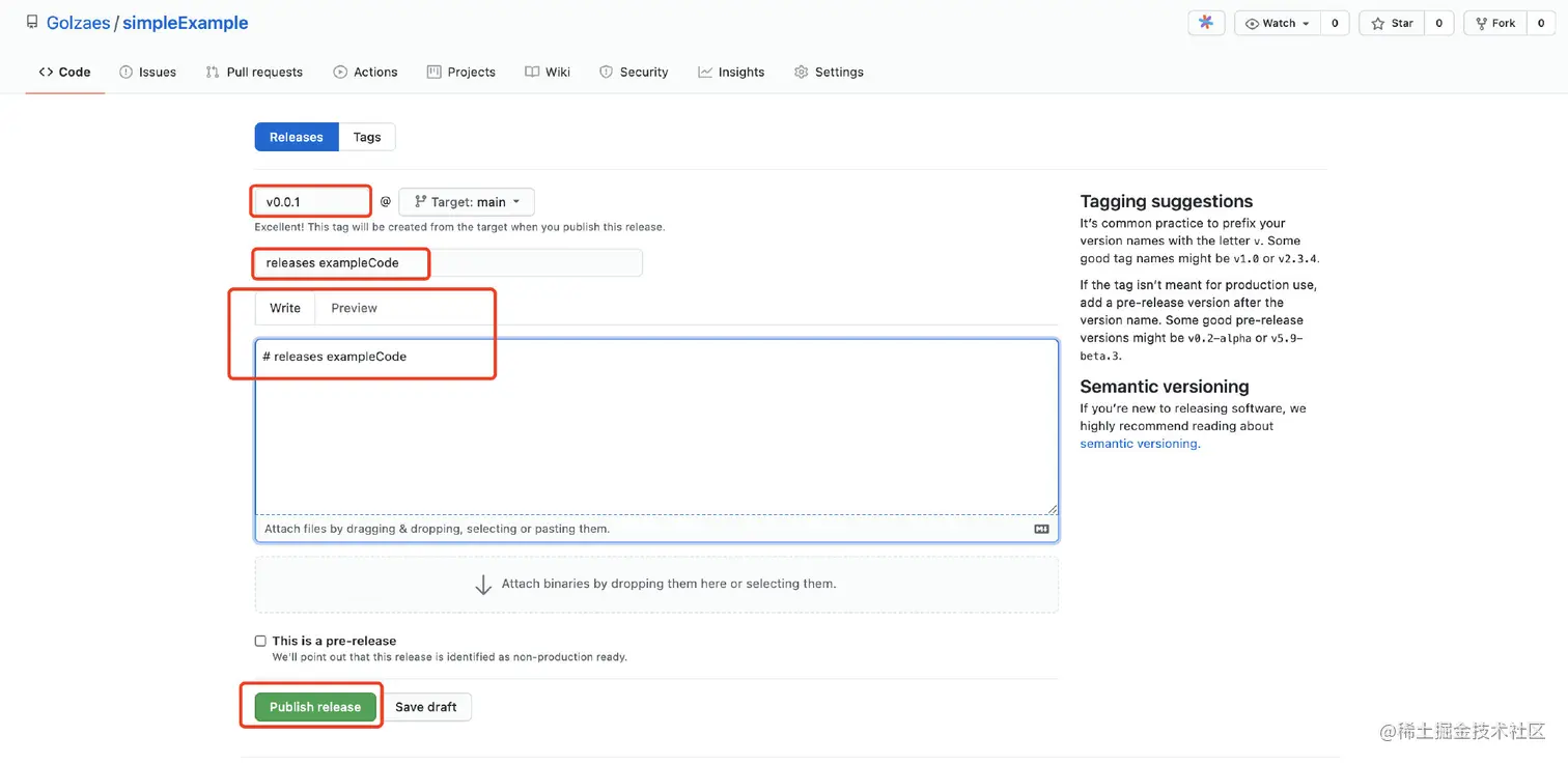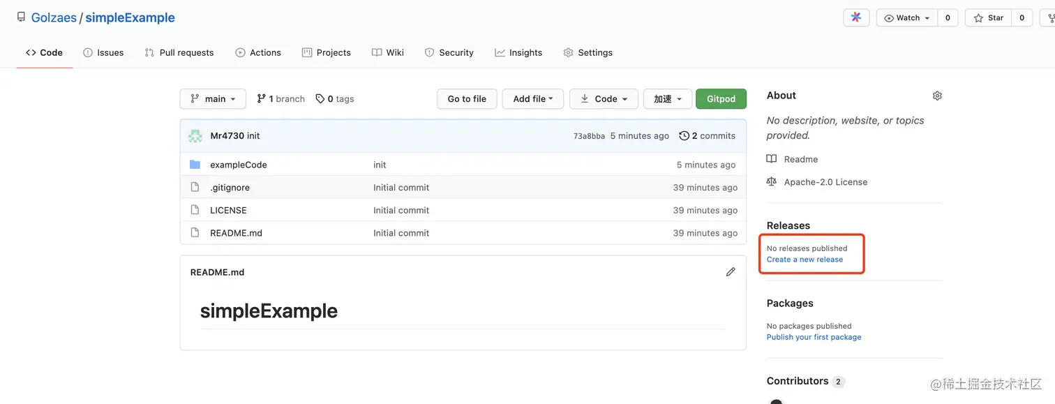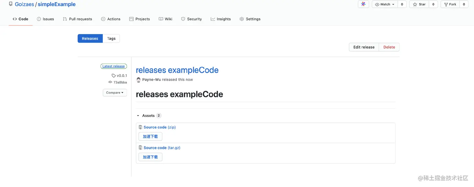 仔细对比就会发现,这里多了个exampleCode文件夹。到这里我们就已经将代码push到了github,接下来我们发布一个,这样我们可以在另外一个项目中以第三方包的形式使用